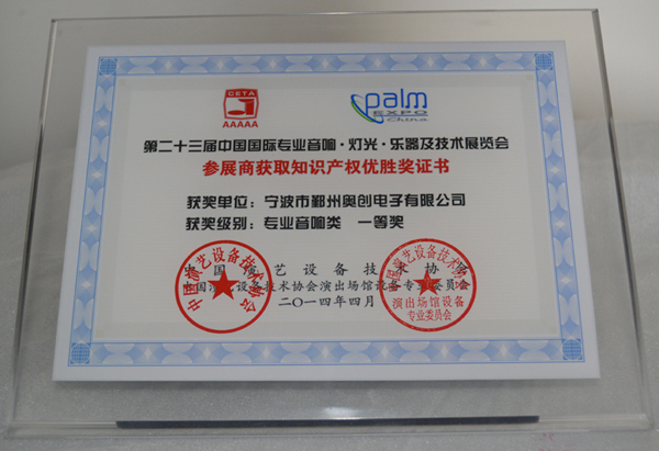 寧波市鄞州奧創(chuàng)電子有限公司憑借強(qiáng)勁的技術(shù)研發(fā)實力,在眾多參展商中脫穎而出,并以絕對優(yōu)勢勇奪“2014年度PALM展參展商獲取知識產(chǎn)權(quán)優(yōu)勝獎專業(yè)音響類一等獎”。這是對奧創(chuàng)公司辛勤耕作,不斷開拓進(jìn)取的肯定與激勵,我們將繼續(xù)以走創(chuàng)新之路,在專業(yè)音頻設(shè)備領(lǐng)域為行業(yè)的發(fā)展和國家文化事業(yè)的繁榮,做出更大的貢獻(xiàn)。