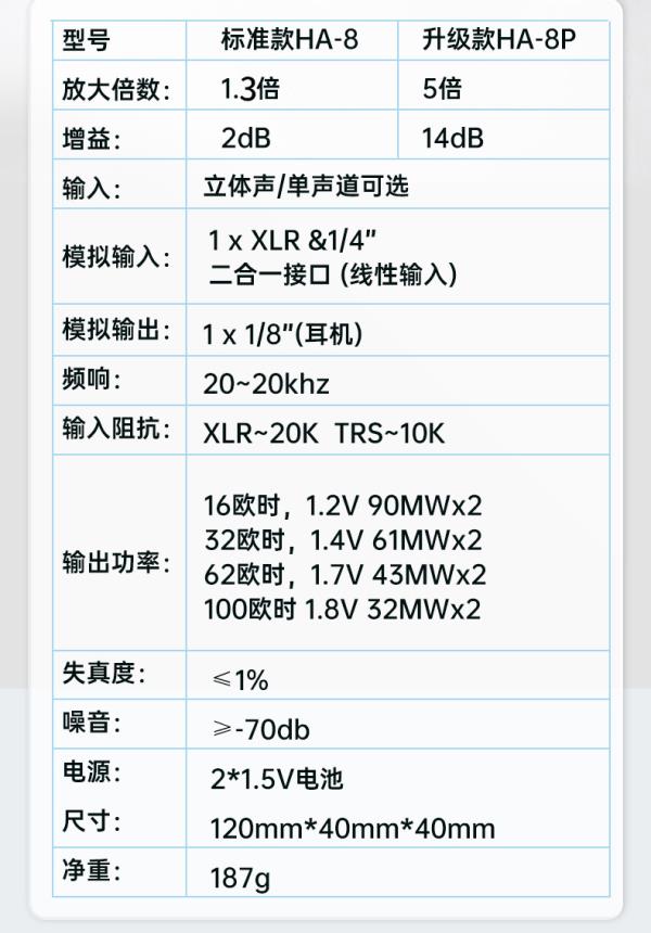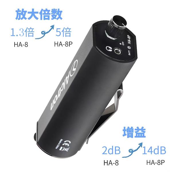 鋁合金機身,搭配經典黑色,堅固又耐看。 長度僅120mm,凈重僅187g,可夾在皮帶或背包肩帶上隨意行動。 身材雖然小巧,能量卻大大升級。放大倍數(shù)由原來(HA-8)的1.5倍升級到(HA-8P)的5倍,增益由原來(HA-8)的2dB升級到(HA-8P)的14dB,給您更多選擇空間。 匹配多種設備