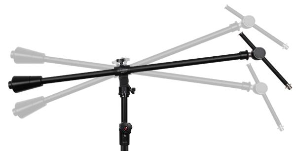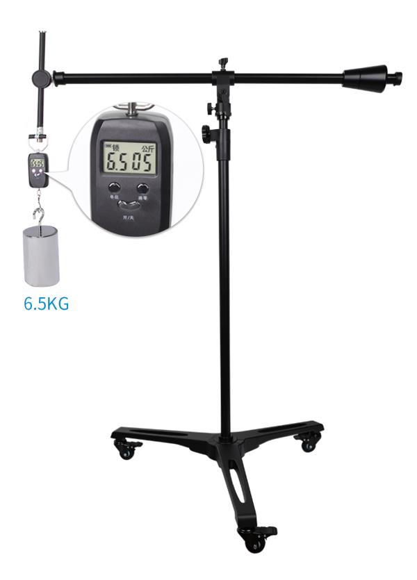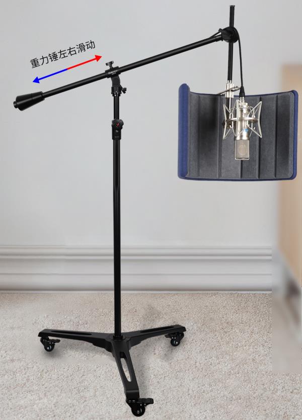 橫桿上帶有一個(gè)可滑動(dòng)的鐵制重錘,可根據(jù)橫桿左右長(zhǎng)度、掛載話筒或其他設(shè)備的重量,來(lái)調(diào)節(jié)重錘的前后距離,從而保持平衡。