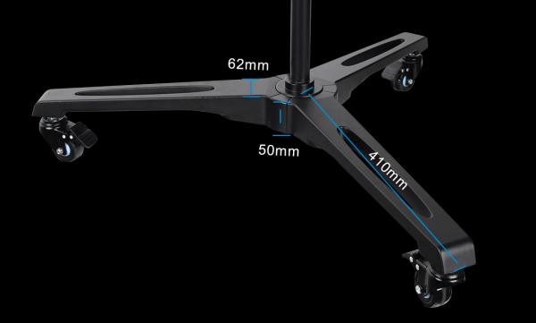 三角金屬底座搭配PU聚氨酯萬(wàn)向輪,不發(fā)出噪音,不刮花地面;自帶剎車(chē)片,只需輕按鎖緊即可固定支架,擺放移動(dòng)更加靈活高效。